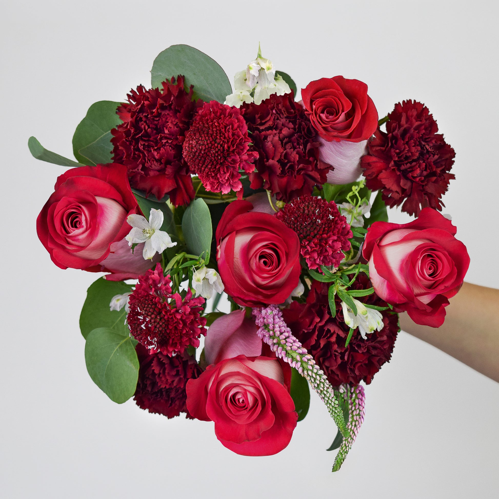 Saturated garnet tones and blush-pink contrast give this bouquet its rich, jewel-like drama, anchored by bold roses and velvety burgundy carnations. Textural accents (scabiosa, veronica, and delicate white blooms) weave through eucalyptus greens for a finish that feels passionate and composed.